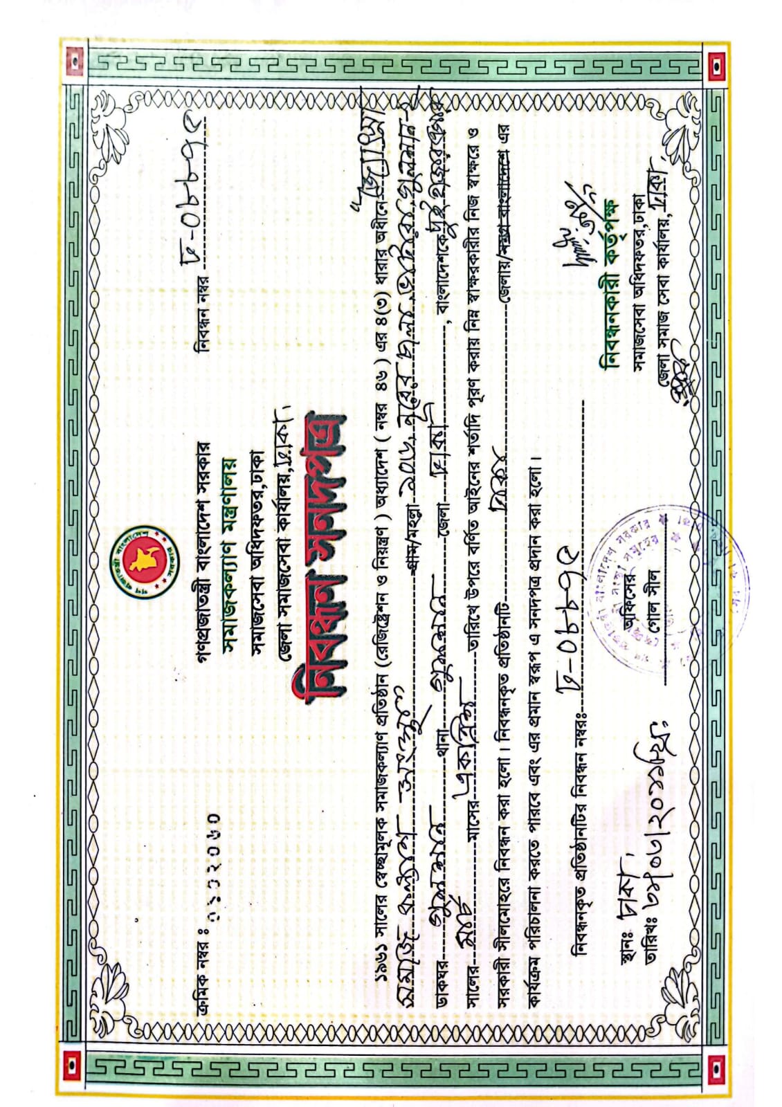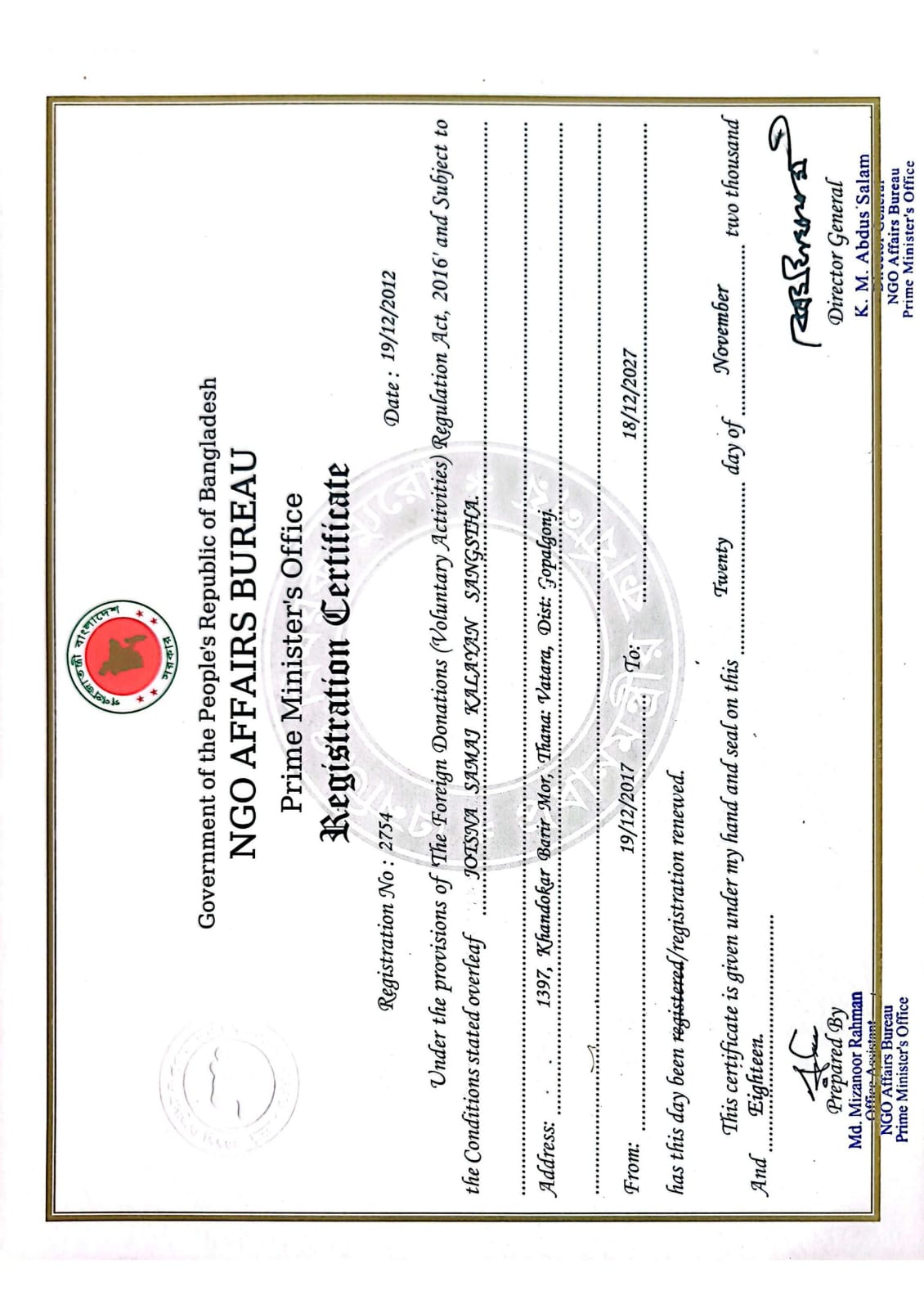 JSKS is Registered with the Directorate of the Social Welfare Services, and NGO Affairs Bureau of the People’s Republic of Bangladesh bearing Registration No- DSS/Da-08875, Date: 31.3.2011 and FDR-2754, Date : 19.12.12